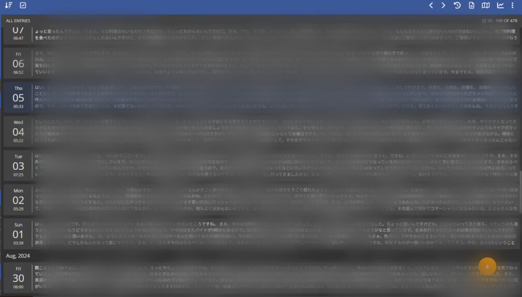 プライベートな内容なので軽くぼかしますが、毎日のエントリーに文字がぎっしり書かれているのはなんとなくおわかりいただけるでしょうか。