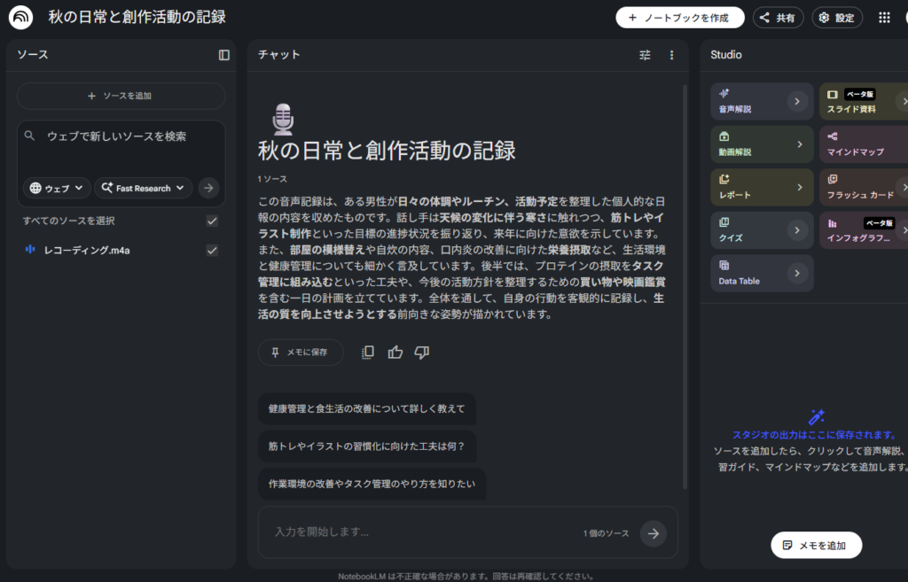 今は他のAIツールでも音声の文字起こしを無料でやってくれるものくらいはたくさんあるのかもしれませんが、NotebookLMでやりなれているし、しばらくはそのスタイルでやっていくつもりです。