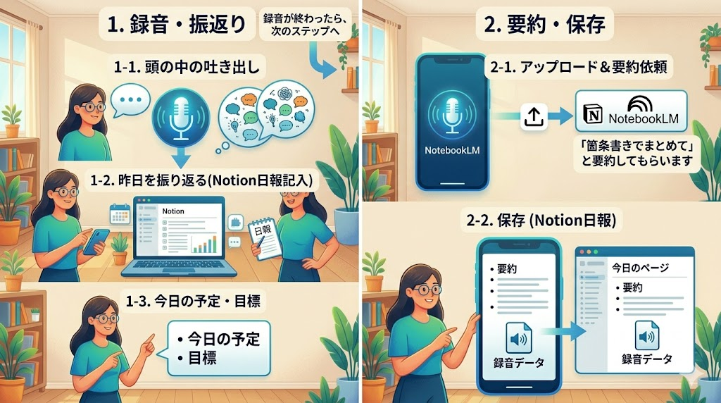 現在のやり方としては、録音を回してから、まずは今頭の中にある言いたいことを吐き出し、そのあとNotionに日報を記入しながら昨日を振り返ります。最後に今日の予定や目標について話します。