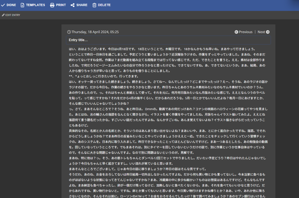 最初は試行錯誤しましたが、以前紹介したDiaroという日記アプリにWindowsの音声入力を使ってひたすら音声入力するという形ができあがりました。