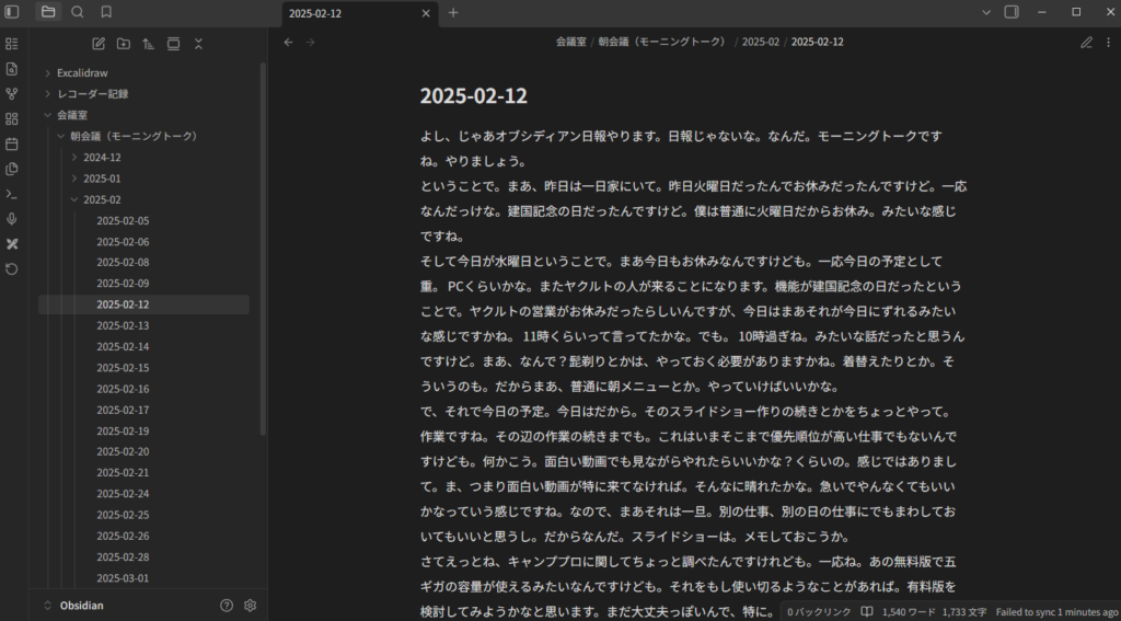 そこから、保存先をObsidianに変更することになります。Obsidianはボイスレコーダーが搭載されていて、文字だけでなく録音データそのものも一緒に残しておけるし、デイリーページみたいなものを作って管理できるので、振り返りやすくていいと思ったからです。