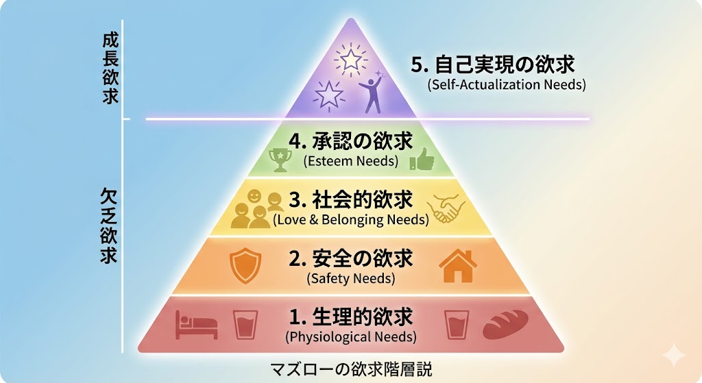 | 第5段階 | 自己実現の欲求 | 自分の持つ潜在的な可能性を最大限に発揮したい、あるべき自分になりたいという欲求。 |