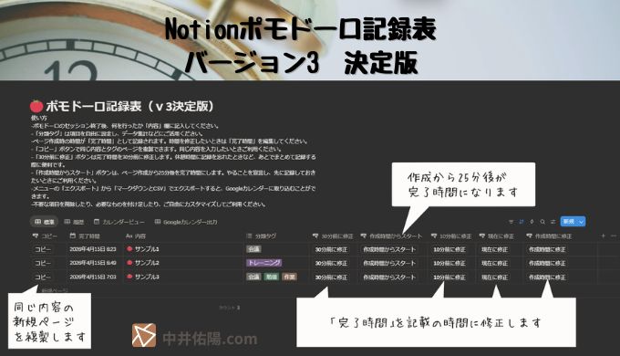 Notionもポモドーロテクニックも世の中に広まりきっているので今更感はありますが、まだ必要な人もいるかもしれないし、何より、古くなったバージョンを見に来た人がいたら申し訳ないという気持ちがあったので、バージョン3の公開は責務だなと、この1年くらいずっと感じていました。今回この記事を書いて、肩の荷が下りた気がします。