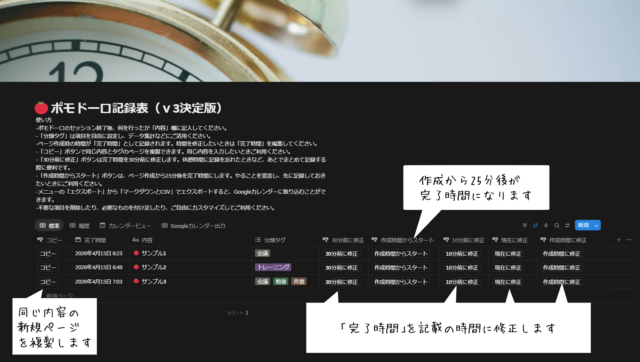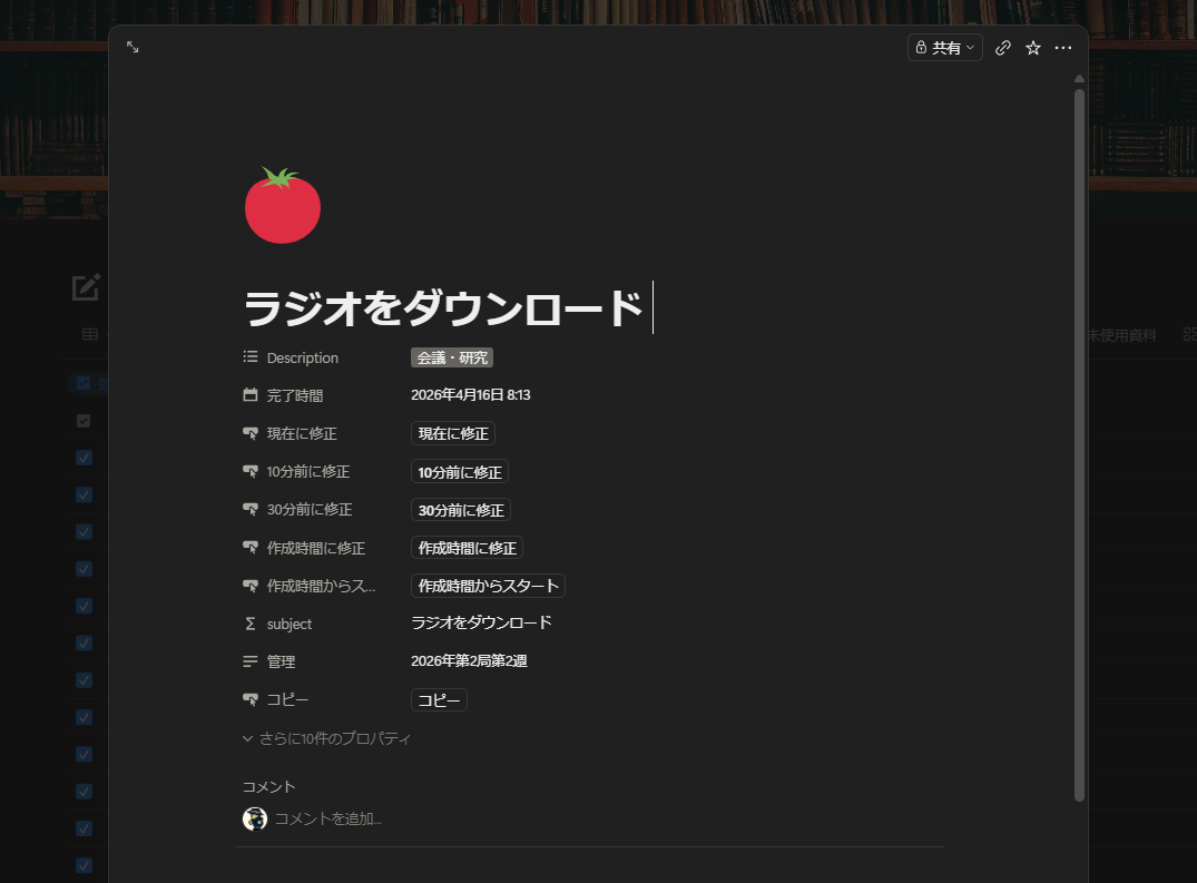 普段使っているタスク管理用のデータベースにボタンを取り付け、ポモドーロ記録表のデータベースに同じタイトルのページを追加できるようにしておくと、取り組んだタスクの内容をそのままポモドーロ表に記録できるので便利になります。