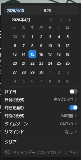 また、スマートフォンの追加ボタンウィジェットや「インスタントNotion」のような外部連携アプリから追加する場合も「完了時間」が設定できない場合が多いです。