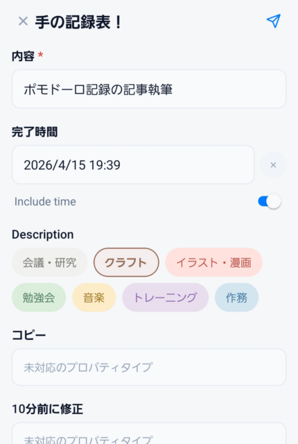 休憩後に続きを行うなど、同じ内容でポモドーロを行った場合、このボタンを押すと同じ「内容」「タグ」のページが複製されます。「完了時間」はボタンを押した時間になります。