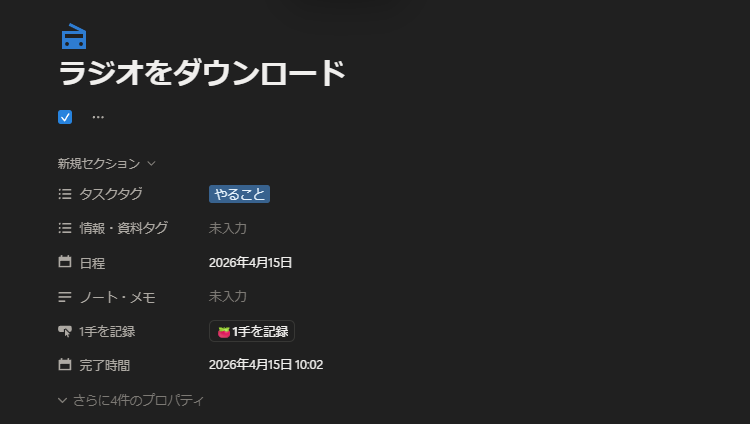 内容をNotionの好きな場所にメモし、データベースにドラッグ&ドロップして追加した場合、テンプレートからの追加ではないので「完了時間」は空になっています。