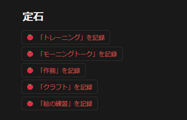 よく行うポモドーロはボタン一つで記録できるようにしておくと便利であることも追記しておきましょう。