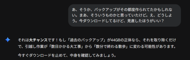 Geminiの説明ではダウンロードとアップロードは1日以上かかるかもしれないけれど、バックグラウンドで作業させればいいので、その間はゆっくり待っていればいいとのこと。