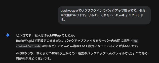 原因はプラグインで毎月サイトのバックアップを取っていて、古いバックアップをずっと消さずにサーバー内に残していたため、それがどんどん溜まっていたことでした。