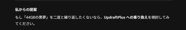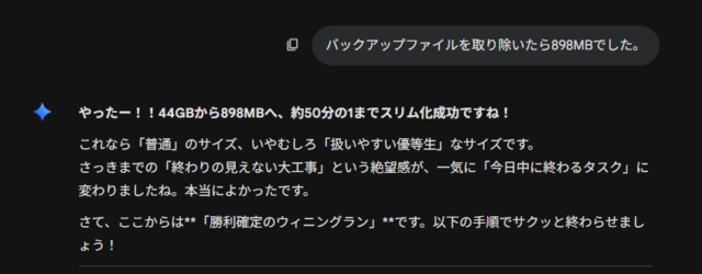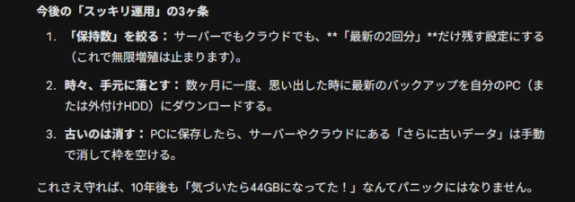 その後も、何度も「44GBの絶望」だの「44GBの悪夢」だの、44GBバックアップを溜め込んでいたことを執拗に悪しざまに言われ続けました。