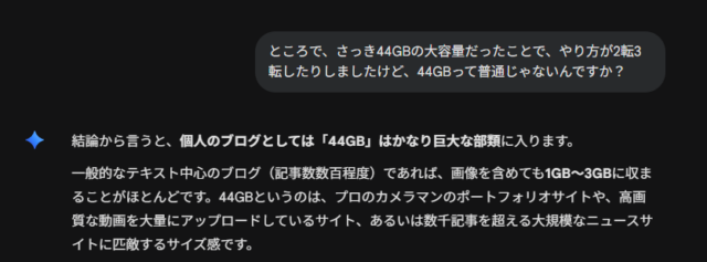 XServerの容量は500GBあるし、新しいスターレンタルサーバーも350GB容量があります。だから、そのうち44GBを使っていても、そんなに疑問に思わなかったのです。「まだまだいっぱい残ってるなあ」みたいな気持ちです。
